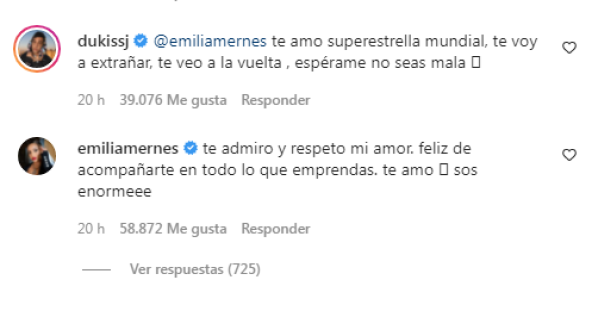 Ante esta hermosa declaración, Duki le respondió: "te amo superestrella mundial, te voy a extrañar, te veo a la vuelta , espérame no seas mala".