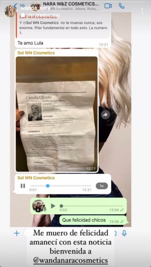 Minutos más tarde, Wanda Nara compartió en sus redes sociales un chat del grupo de su nuevo local e hizo efectiva la contratación de la joven. Muy emocionada escribió: “Muero de felicidad, amanecí con esta noticia. Bienvenida a Wanda Cosmetics”.