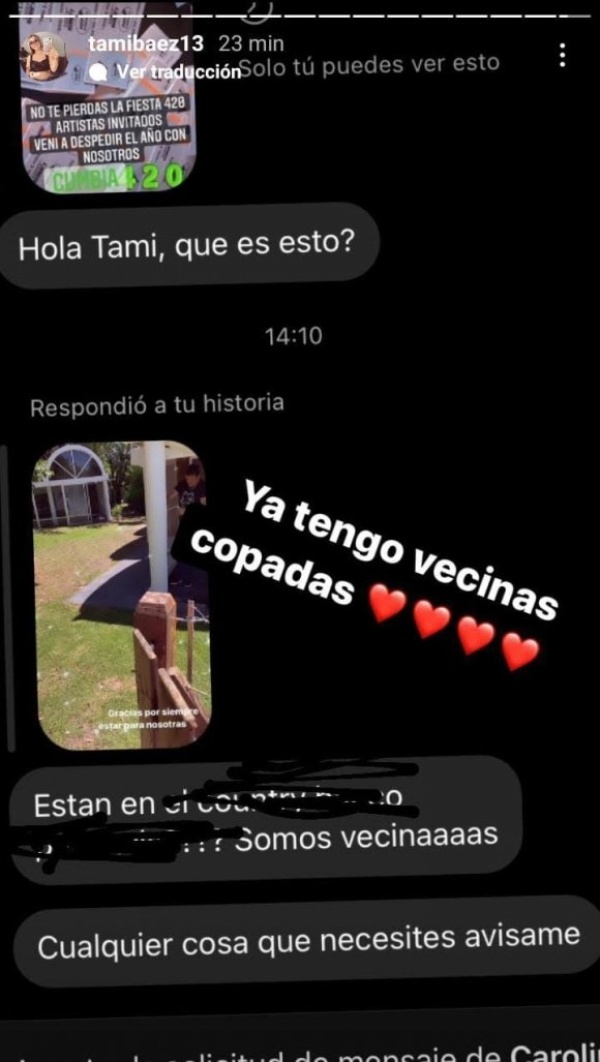 "Somos vecinas, cualquier cosa que necesiten avisame", le escribió su seguidora al preguntarle si estaba en un country específico. Acto seguido y muy contenta, la novia del cantante compartió el chat y replicó: "Ya tengo vecinas copadas".