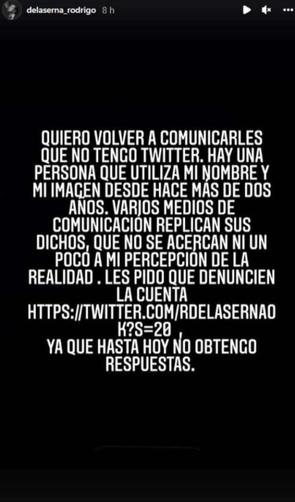 "Quiero volver a comunicarles que no tengo Twitter. Hay una persona que utiliza mi nombre y mi imagen desde hace más de dos años. Varios medios de comunicación replican sus dichos, que no se acercan ni un poco a mi percepción de la realidad. Les pido que denuncien la cuenta ya que hasta hoy no tengo respuestas”,escribió sin filtros.