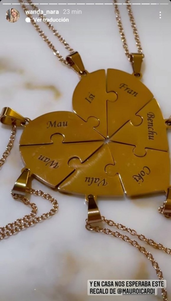 “Y en casa nos esperaba este regalo de Mauro Icardi”, escribió junto a una foto donde se pueden ver varias medallitas de oro que juntas forman un gran corazón. En cada una de ellas, se puede leer los apodos de cada integrante de la familia: Wan, Mau, Isi, Fran, Benchu, Coki y Valu.