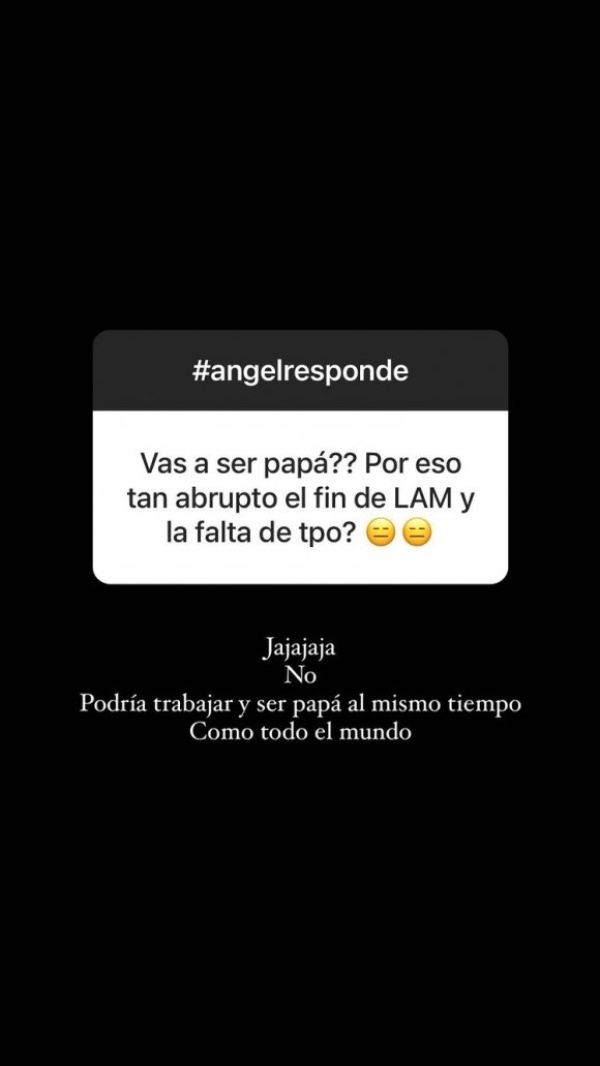 “¿Vas a ser papá? ¿Por eso tan abrupto el final de LAM y la falta de tiempo?", le preguntaron. En seguida Ángel contestó contundente y despejó las dudas: “Ja, jaj, ja. No, podría trabajar y ser papá al mismo tiempo. Como todo el mundo".