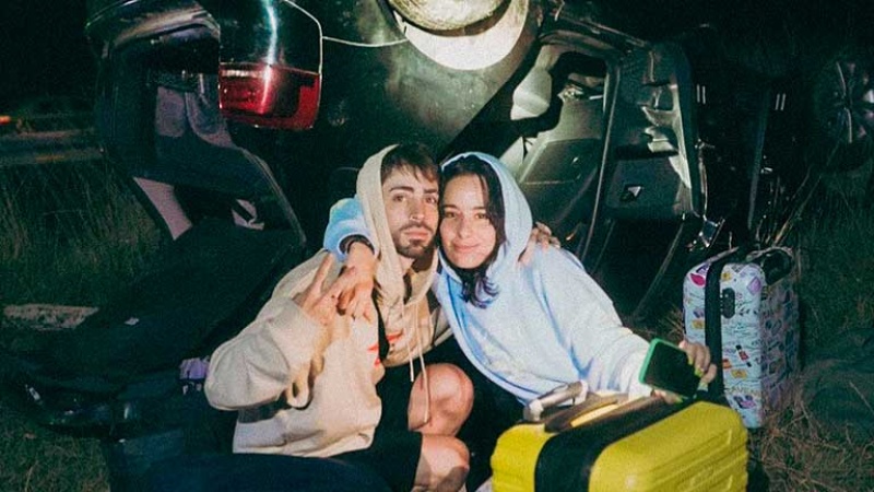 “Me cuidan de todos lados dije y se ve que no mentía”, inició relatando. En su cuenta de Instagram compartió una foto donde se puede ver el auto totalmente destrozado y dado vuelta sobre un campo, mientras ella y Agustín Franzoni posan con sus valijas delante del automóvil.