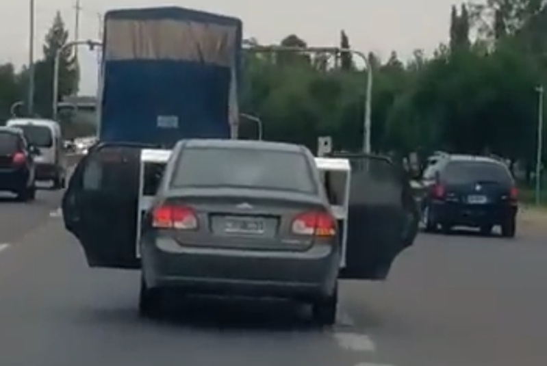 Un Chevrolet Corsa circulaba con las dos puertas traseras abiertas para que entrara un mueble dentro del vehículo.