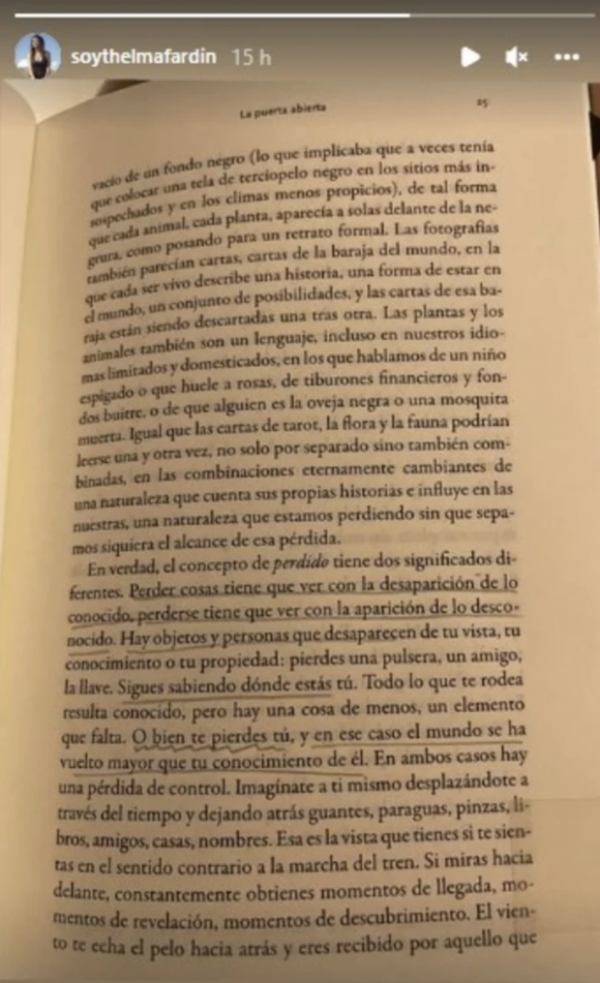 En ese sentido, la actriz que se encuentra atravesando un juicio contra Juan Darthés, compartió una foto donde muestra el libro que está leyendo, con varias frases subrayadas con lápiz, que hacen referencia a una búsqueda personal.