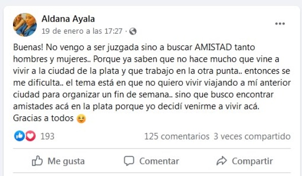 Es el caso de Aldana, una joven que no es de La Plata, pero escribió en un grupo lleno de platenses para poder cumplir con su cometido: encontrar amigos y amigas. O al menos así lo afirmó en un pequeño pero sentido texto, explicando en qué consistía su método.