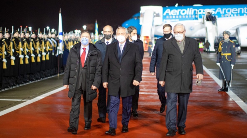 El mandatario argentino llegó a las 14.14 (hora de Argentina) al aeropuerto internacional de Moscú, tras haber partido el martesa las 22.30 desde el aeropuerto internacional de Ezeiza rumbo a la capital rusa en un vuelo de Aerolíneas Argentinas, acompañado por el canciller Santiago Cafiero; el ministro de Economía, Martín Guzmán -quien solo participará de la escala en Rusia-; los gobernadores de Río Negro, Arabela Carreras; de Buenos Aires, Axel Kicillof, y de Catamarca, Raúl Jalil; y la portavoz de la Presidencia, Gabriela Cerruti.