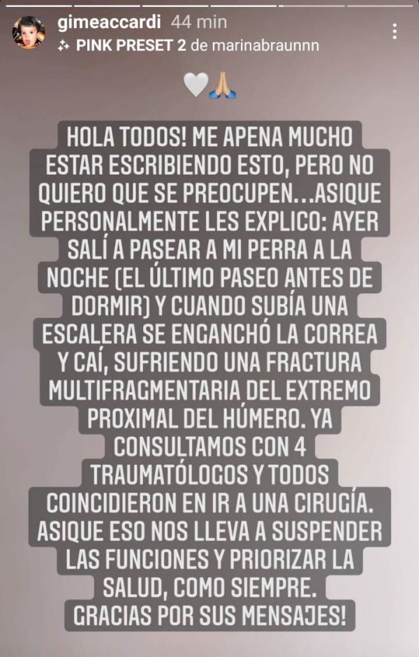 "Salí a pasear a mi perra a la noche (el último paseo antes de dormir) y cuando subía la escalera se enganchó la correa y caí, sufriendo una fractura. Ya consultamos con cuatro traumatólogos y todos coincidieron en ir a una cirugía. Así que eso nos lleva a suspender las funciones y priorizar la salud, como siempre. Gracias por sus mensajes", comentó Accardi acerca de su estado de salud.