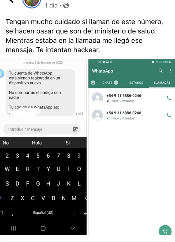"Tengan mucho cuidado si llaman de este número, se hacen pasar por el Ministerio de Salud. Mientras estaba en la llamada me llegó ese mensaje. Te intentan hackear", aseguró Sofía, la mujer afectada.