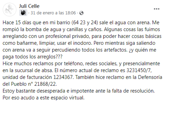 Según contó, la situación ocurre desde hace varios días y expresó: "me rompió la bomba de agua, canillas y caños".