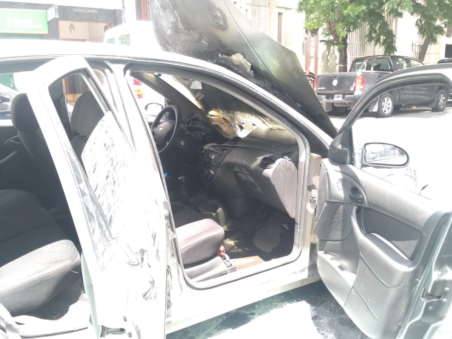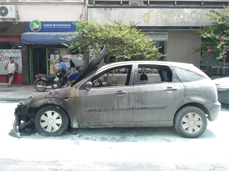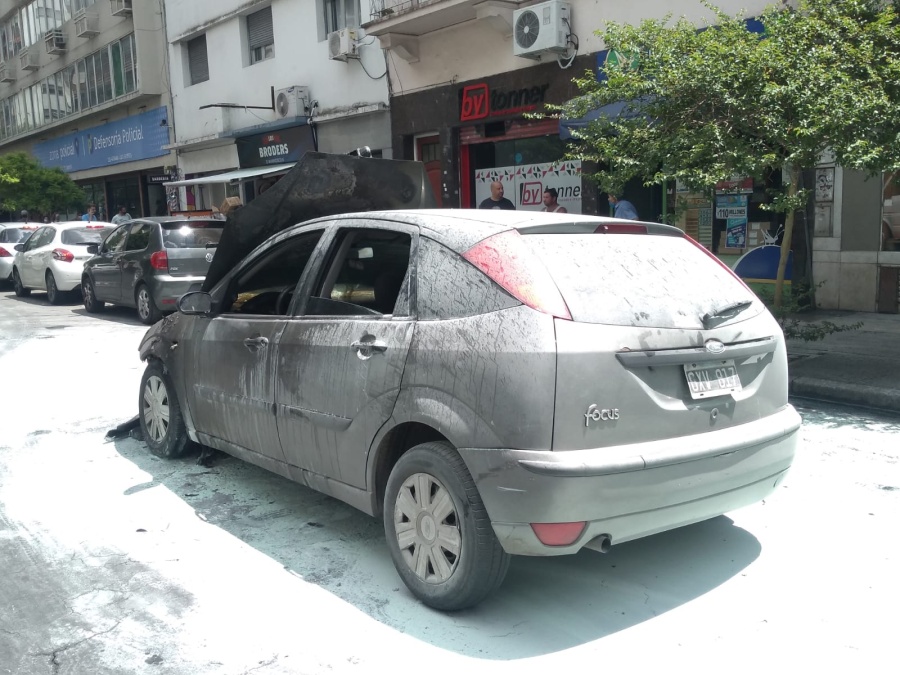 Un auto que circulaba por el centro de la ciudad se prendió fuego luego se sufrir un desperfecto técnico que lo obligó a frenar y a hacer descender a todos los que venían en su interior.