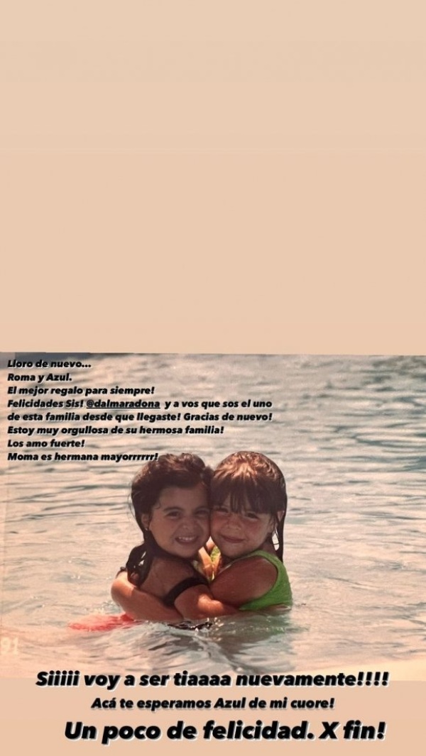 Por su parte, su hermana, Gianinna Maradona expresó toda su felicidad en las redes sociales, junto a una foto de ellas dos de chiquitas en la playa. “Lloro de nuevo. Roma y Azul. ¡El mejor regalo para siempre!”, escribió muy conmovida.