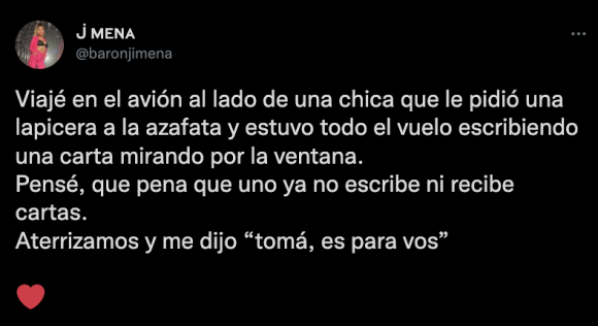 Sin darle mayor atención, Barón pensó en lo lindo que era recibir cartas y en cómo esa costumbre se fue perdiendo. "Viajé en el avión al lado de una chica que le pidió una lapicera a la azafata y estuvo todo el vuelo escribiendo una carta mirando por la ventana. Pensé, 'qué pena que uno ya no escribe ni recibe cartas'”, relató en sus redes sociales.