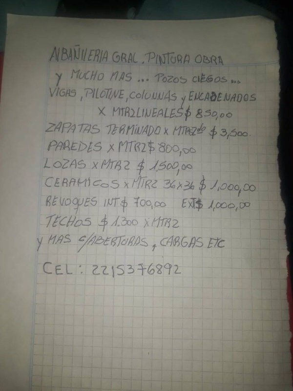 En la imagen se lee: albañilería general, pintura, techos, pozos ciegos, zanjas,con menbrana, jardinería "y mucho más". El número que figura es 221 537 6892, y él asegura que tiene muchas ganas de trabajar.
