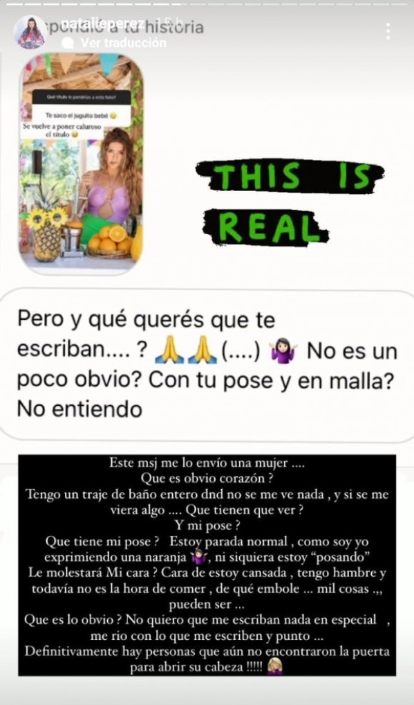 Sin dejarlo pasar, Natalie hizo público ese comentario e hizo un fuerte descargo. “¿Qué es obvio, corazón? ¿Que tengo un traje de baño enterizo con el que no se me ve nada? Y si se me viera algo, ¿qué tiene?”, empezó muy enojada.