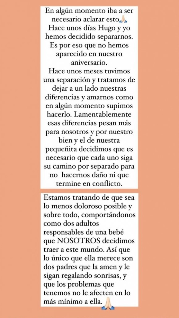 La modelo lo confirmó ne su cuenta de Instagram: "En algún momento iba a ser necesario aclarar esto. Hace unos días Hugo y yo decidimos separarnos. Es por eso que no hemos aparecido en nuestro aniversario".