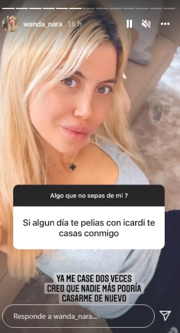 Además, decidió responder a algunos de los mensajes de sus fans. En este sentido, un fan le consultó: "Si algún día te peleás con Icardi, ¿te casás conmigo?", a lo cual Wanda fue muy contundente: "Ya me casé dos veces, creo que nadie más podría casarme de nuevo".