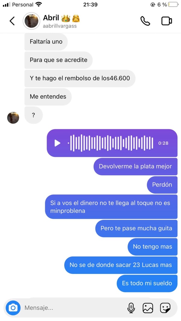 "Ahora no voy a comer por dos meses porque no tengo ni laburo y nadie me devuelve mi platita ahorrada, pero me gustaría que me ayuden a recuperarla, estoy muy mal, me destruyó. Soy una simple estudiante que quería progresar y me hacen esto", dijo con mucho pesar.