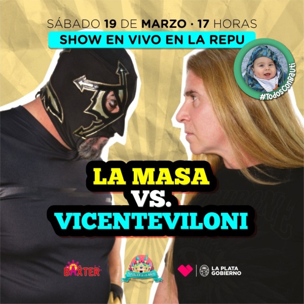 Con la premisa colaborar con la campaña solidaria #TodosConBauti, la Municipalidad de La Plata brindará este sábado un espectáculo de lucha libre entre los legendarios personajes de La Masa y Vicente Viloni, quienes volverán a enfrentarse en el ring con un show en vivo para toda la familia.