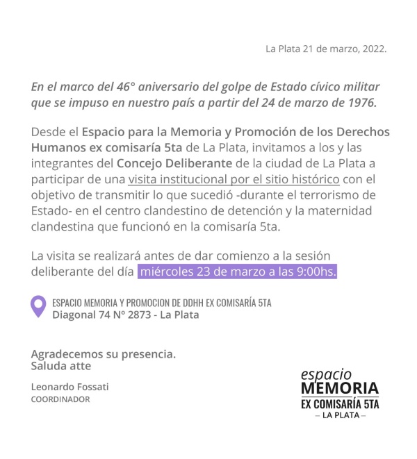 Previo a la sesión especial, a las 9 de la mañana, se realizará una visita guiada con el objetivo de "transmitir lo que sucedió en el centro clandestino de detención y la maternidad clandestina que funcionó" en la ciudad de La Plata.