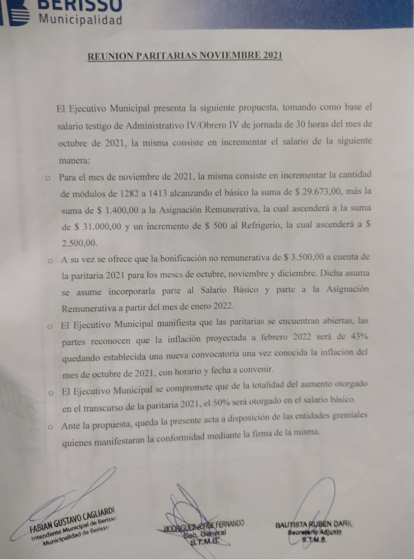 En ese sentido, desde el sindicato compartieron el punto 3 del acuerdo paritario firmado en noviembre del 2021: “El Ejecutivo Municipal manifiesta que las paritarias se encuentran abiertas, las partes reconocen que la inflación proyectada a febrero será del 43 % quedando establecida una nueva convocatoria una vez conocida la inflación del mes de octubre de 2021, con horario y fecha a convenir”.