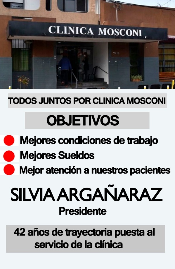 El miércoles 30 de Marzo es la fecha pactada para que las y los trabajadores de la Clínica Mosconi pueda votar y elegir a la nuevas autoridades. En los comicios se presentan dos listas, por su parte la oficialista liderada por Celeste Monzón, lista que se encuentra debajo del ala de la actual gestión presidida por Salvador Esposito y la lista encabezada por Silvia Argañaraz “Todos Juntos por Clínica Mosconi”, quienes buscan revertir la situación en la que se encuentra la Cooperativa.