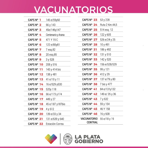 Las dosis podrán ser aplicadas de manera gratuita en el vacunatorio central (55 entre 18 y 19) que funcionará de lunes a viernes de 8 a 12 y de 13 a 17 horas; como así también en los 46 centros de Atención Primaria de la Salud (CAPS) a disposición de los vecinos en todos los barrios platenses.