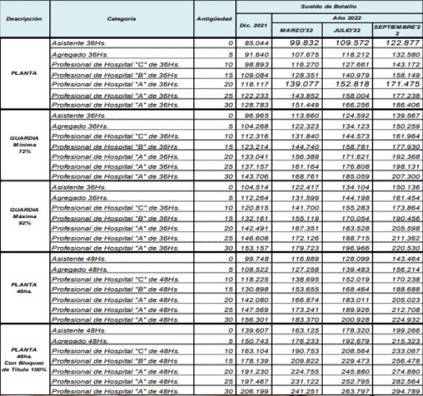 Con el incremento, detalló el gremio, el salario ingresante de 36 horas planta pasa de $ 85.044 a $ 99.832 en marzo, $ 109.572 en julio y $ 122.877 en septiembre; mientras que el salario ingresante de 36 horas en la Guardia en día hábil aumenta (en los mismos meses) de $ 96.965 a $ 113.660, $ 124.592 y $ 139.567; y el de 48 horas con Bloqueo Ingresante sube de $ 139.607 a $ 163.125, $ 178.320 y $ 199.266.