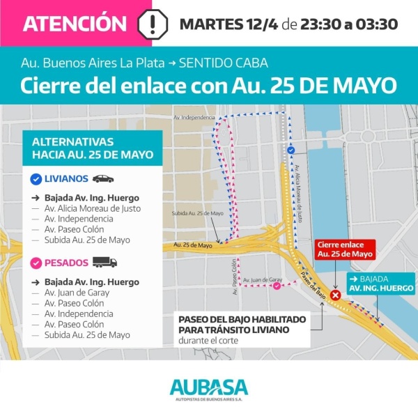 La empresa Autopistas Buenos Aires (Aubasa) informó que durante el día de mañana, 12 de abril, a partir de las 23.30 y durante el lapso de cuatro horas, el enlace de la Autovía Buenos Aires – La Plata con la Autopista 25 de Mayo estará cerrada por obras a cargo de Ausa.
