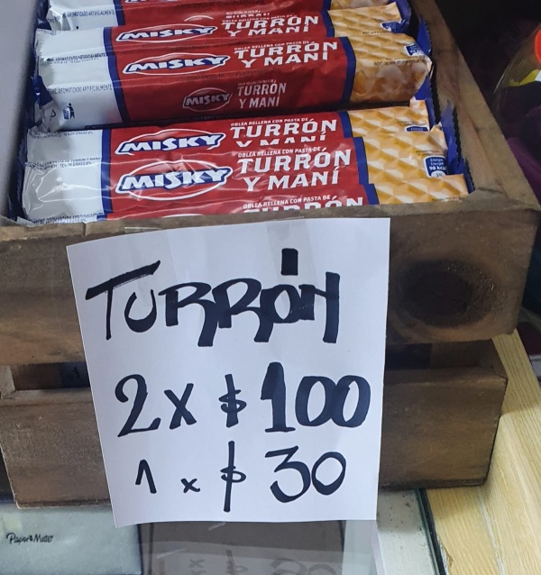 En el kiosco se podía leer la siguiente promo: tres turrones por 100 pesos y cada uno por 30.