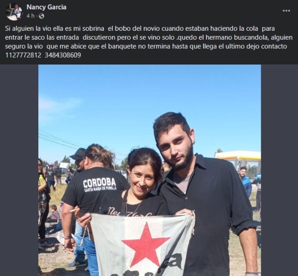 La familia, que viene siguiendo a la banda durante su gira a lo largo del país, denunciaron en las redes sociales el episodio y pidieron colaboración para encontrarla lo antes posible.