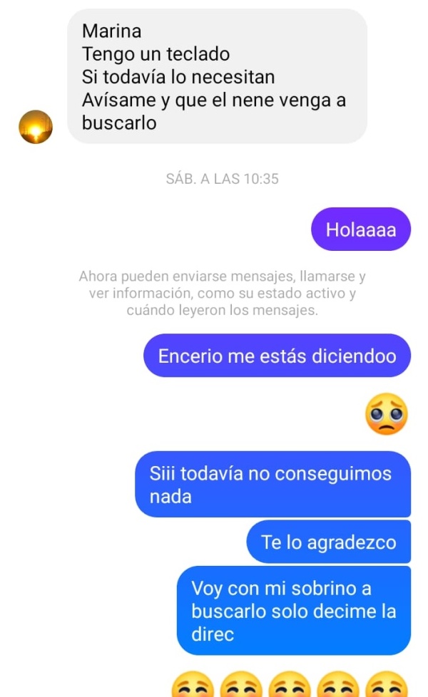 “Marina, tengo un teclado. Si todavía lo necesitan avísame y que el nene venga a buscarlo”, le llegó a su celular. No lo podía creer. “En serio me estás diciendo”, se sorprendió la tía. Inmediatamente partieron con Joaquín a su encuentro.