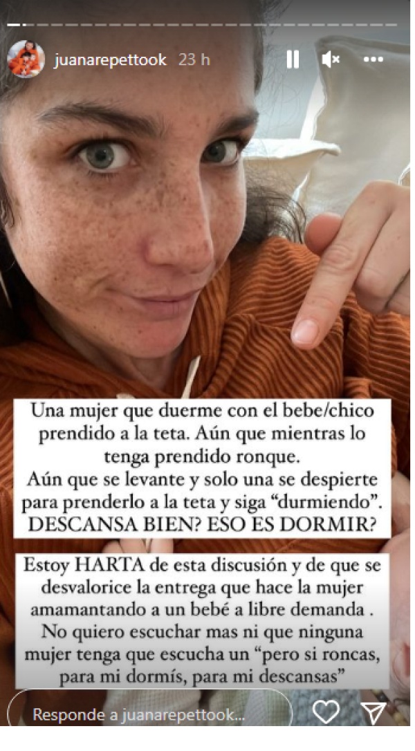 Además confesó: "Estoy harta de esta discusión y de que se desvalorice la entrega que hace la mujer amamantando a un bebé a libre demanda. No quiero escuchar más ni que ninguna mujer tenga que escuchar un 'pero si roncás para mí dormís, descansás'.