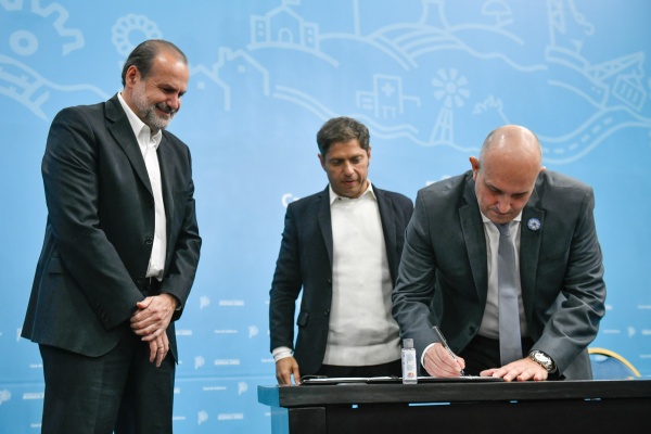 En el marco del Plan 6 por 6 para la recuperación y la transformación de la provincia de Buenos Aires, el gobernador Axel Kicillof suscribió esta tarde convenios que permitirán fortalecer la infraestructura de los puertos de Bahía Blanca y Coronel Rosales. Fue en el Salón Dorado de la Casa de Gobierno, junto al ministro de Transporte de la Nación, Alexis Guerrera; y su par provincial de Producción, Ciencia e Innovación Tecnológica, Augusto Costa.