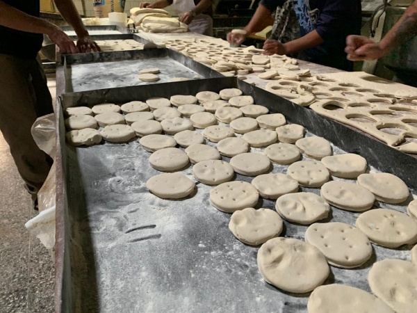 Hoy ya se repasa el “equipo” que va a trabajar. La última vez, pre-pandemia, fueron 50 personas y ahora tienen alistadas unas 40. Todas deben tener noción del trabajo panaderil. Se dividen entre los que amasan –en dos o tres equipos- los que dividen y empaquetan las tortas ya cocinadas y los que hacen el despacho. El ritmo es frenético, todo el proceso lleva casi una hora y media y desde que salen del horno hasta la mano del cliente habrá una demora de 7 minutos por lo que al agarrar el papel de color madera con el logo del local la masa aún quema.