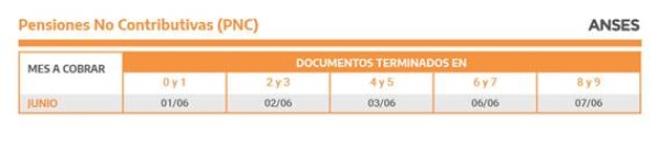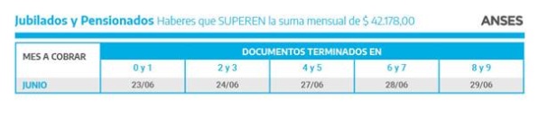 Por su parte, las pensiones no contributivas comenzarán a cobrar según terminación de DNI desde el primer día del mes, las jubilaciones con haberes que no superen 37.524 pesos (sin contar el aguinaldo) lo harán el 8 de junio, y los haberes que superen los 37.524 pesos comenzarán a percibirlo desde el 23.