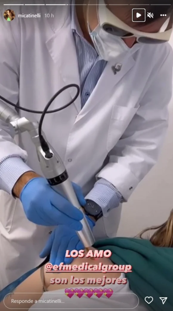 En plena sesión, Mica compartió a través de sus stories de Instagram imágenes que la muestran recostada en la camilla, boca abajo, mientras un profesional aplica un láser sobre el tattoo que se busca eliminar.