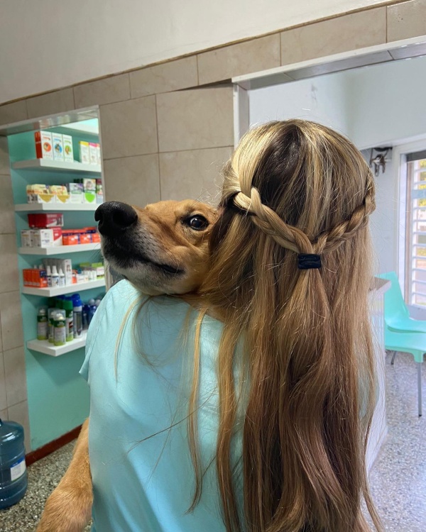 Abrazado a la mujer que debió operarlo para poder castrarlo. Así se lo ve a uno de los rescatados, que además ahora se encuentra en busca de una familia que lo adopte y lo ame por siempre.
