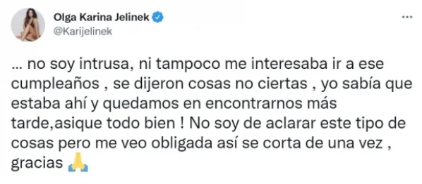 "No soy intrusa ni tampoco me interesaba ir a ese cumpleaños, se dijeron cosas no ciertas, yo sabía que estaba ahí y quedamos en encontrarnos más tarde, todo bien...".