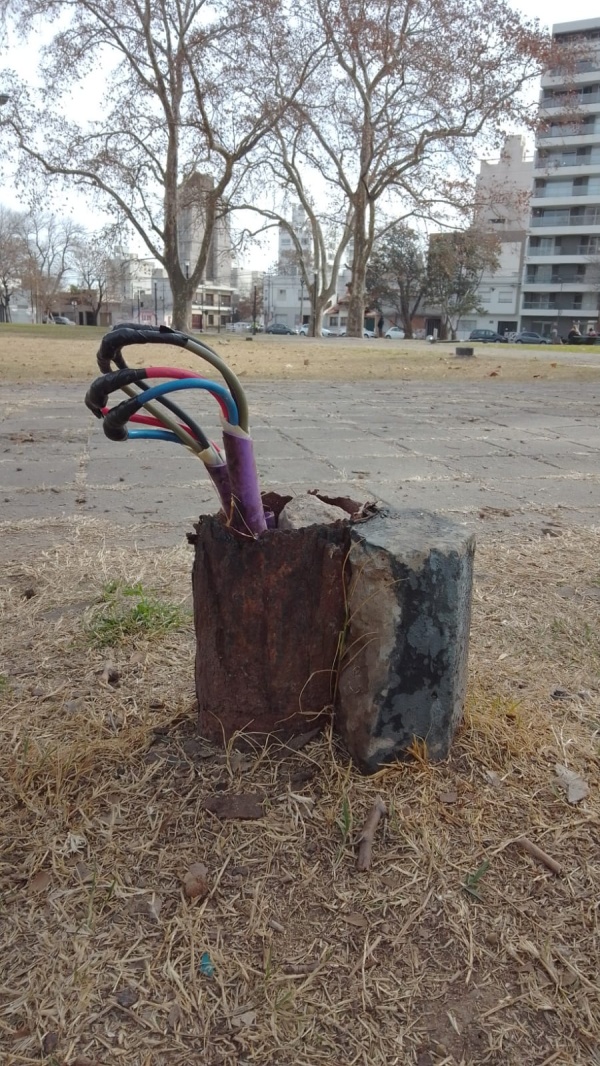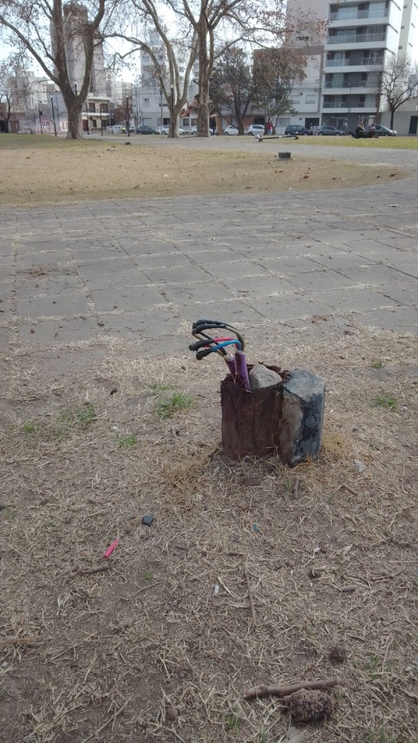 Según las imágenes que compartió, una serie de cables ponen en riesgo a los niños que concurren al predio ubicadao en 13 y 38.