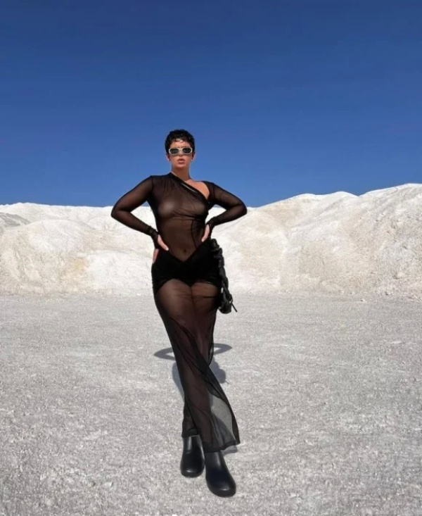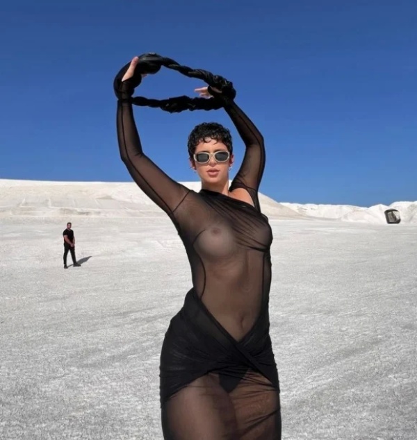 Además, contrastó esta prenda audaz y sensual con unos anteojos de sol grises futuristas.