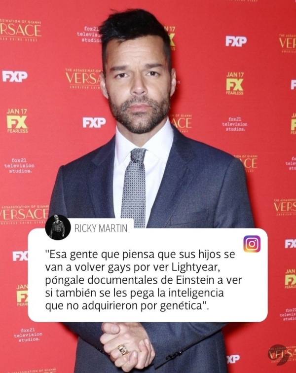 “Esa gente que piensa que sus hijos se van a volver gays por ver Lightyear, póngale documentales de Einsten a ver si también se les pega la inteligencia que no adquirieron por genética”, dice el texto que compartió Ricky Martin desde la cuenta de Instagram.