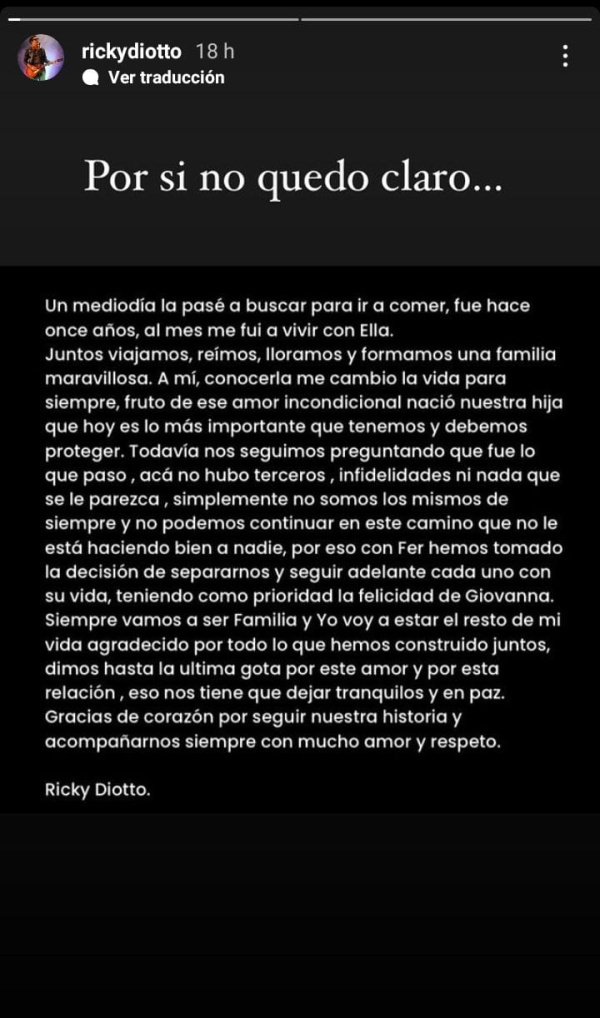 En su cuenta de Instagram, Ricky volvió a compartir el texto que publicó una vez que se separaron.
