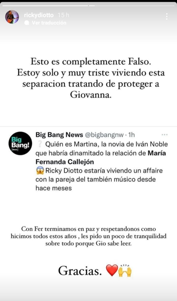 Después de que comenzara a circular el rumor de infidelidad tras la ruptura entre María Fernanda Callejón y Ricky Diotto, con quien tuvo a Giovanna, su ex pareja rompió el silencio.