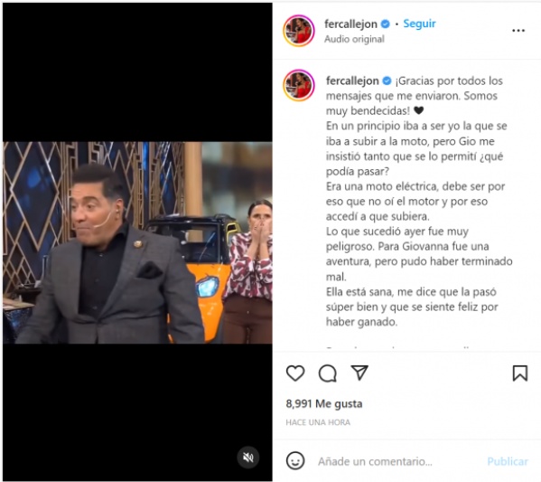 Pasado el tremendo susto, María Fernanda Callejón publicó un descargo sobre el imprevisto momento en que Giovanna, su hija de siete años, arrancó una moto en medio de La Noche del Domingo.