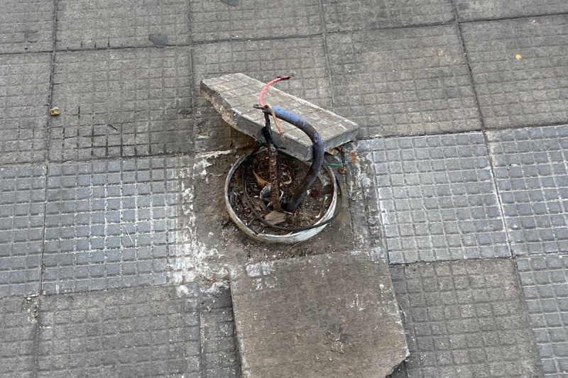 Según explicaron, no saben con exactitud qué deberían haber allí, pero lo cierto es que ahora hay un conjunto de cables que representan "un gran peligro. Pasan muchas familias caminando, pasan animales que los pueden morder, y están ahí, en el medio de la vereda".