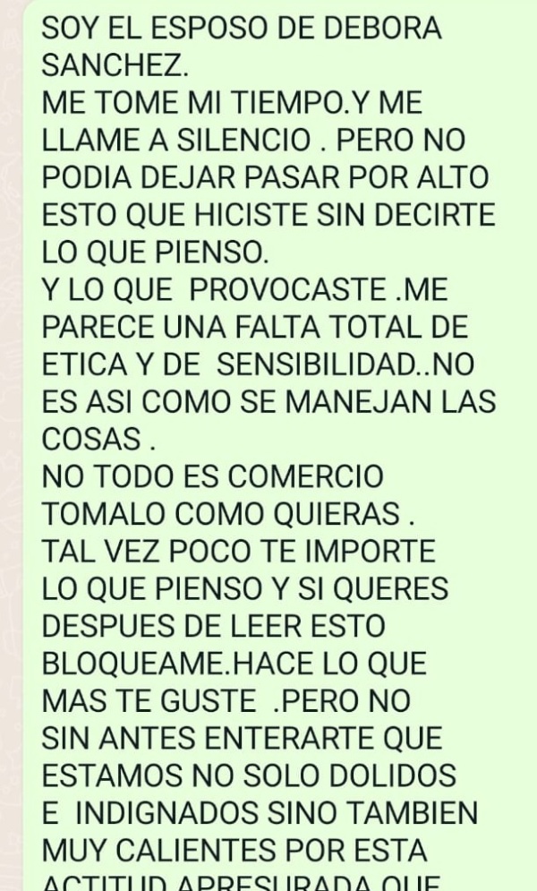 “Queríamos que nos avisaran con anticipación”, explicó Débora. Su marido le mandó un duro mensaje al encargado. “Jugaste con la ilusión y el sueño de un montón de niñas, adolescentes y adultas”, “es una gran bajeza la determinación que tomaste y todo por guita. Lamentable”, y “todo lo malo vuelve en esta vida”, fueron algunas de las frases fuertes.