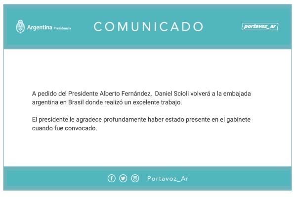 “A pedido del Presidente Alberto Fernández, Daniel Scioli volverá a la embajada argentina en Brasil donde realizó un excelente trabajo. El presidente le agradece profundamente haber estado presente en el gabinete cuando fue convocado”, informó un comunicado de Casa Rosada.