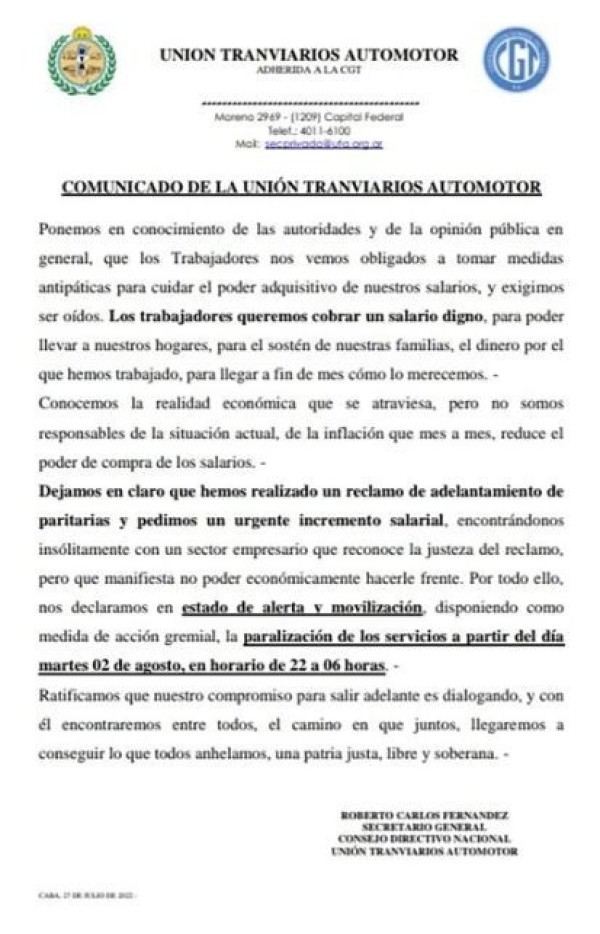 La conducción de la UTA, con Roberto Fernández a la cabeza, emitió un comunicado donde informó sobre los motivos de la huelga. Fernández -que recientemente renovó la conducción del gremio-- aseguró que la organización "se ve obligada a tomar medidas antipáticas para poder cuidar los salarios y exigir ser oídos".