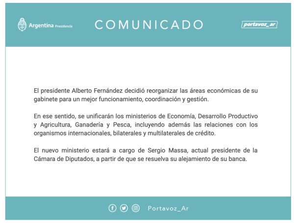 En ese sentido, se unificarán los ministerios de Economía, Desarrollo Productivo y Agricultura, Ganadería y Pesca, incluyendo además las relaciones con los organismos internacionales, bilaterales y multilaterales de crédito.